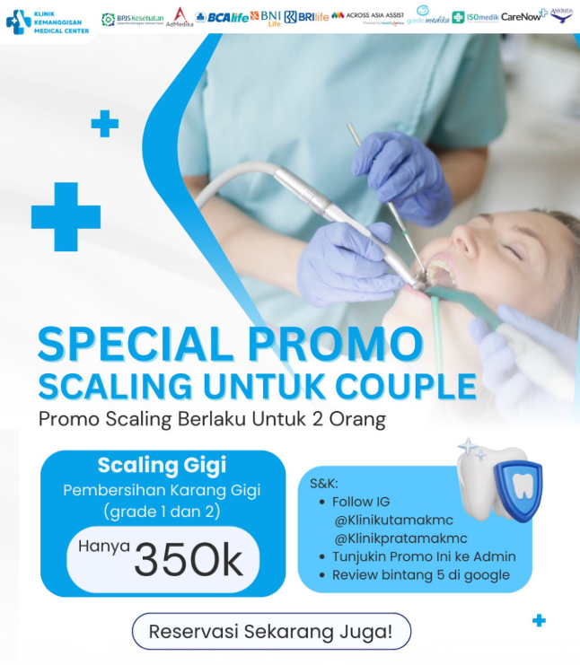 Scaling Gigi bersama pasangan jauh lebih hemat. Dapatkan promonya sekarang sebelum kehabisan. Hindari nafas bau di tahun yang baru dengan scaling di Kemanggisan Medical Center