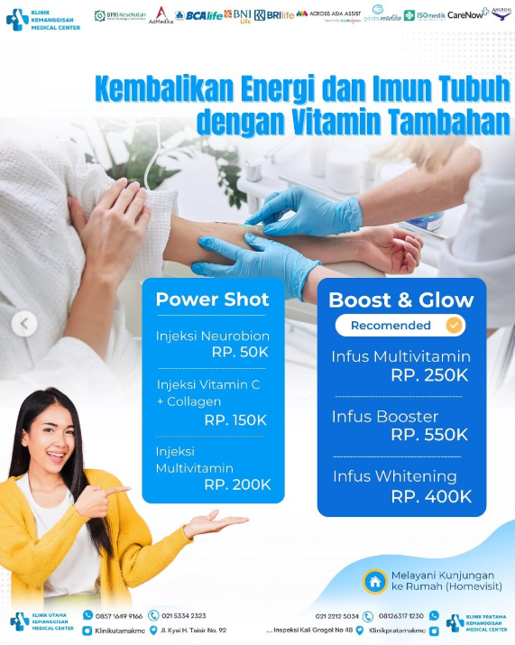 Hallo Sobat Kmc! ☺️ Lagi ngerasa gampang capek, lesu, atau gampang sakit? 😣 Mungkin tandanya imun kamu lagi drop, lohh! Yuk, booster vitamin biar tubuh kembali fit dan semangat beraktivitas 💪✨ Yuk Hubungi Whatsapp kami untuk dapatkan promonya